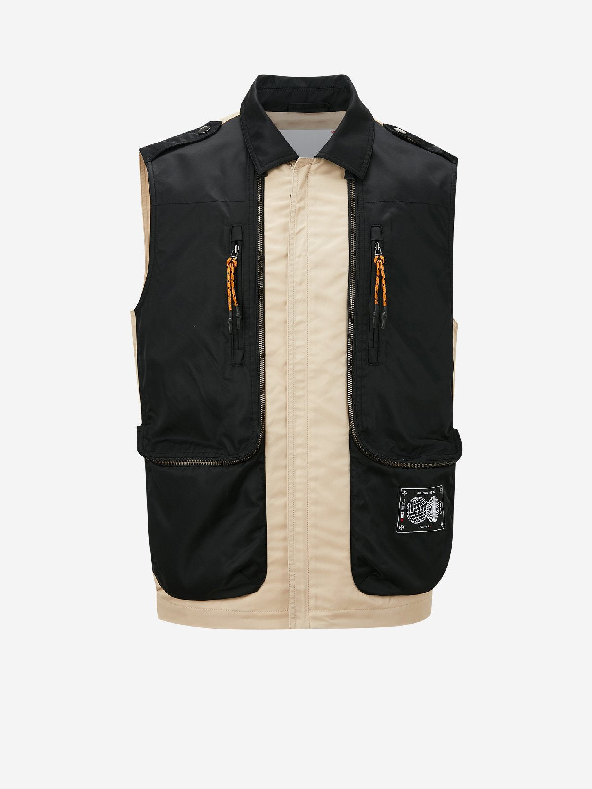 Black and tan fishermen vest with bold orange zipper detail. Multiple pockets provide practical storage for tackle and essential gear. Built for serious anglers who demand both functionality and style on the water.